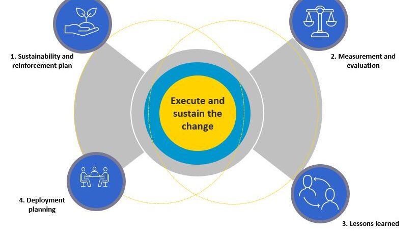 Refer to the change impact assessment and change readiness results to build on the targeted behaviours/actions/skills required to sustain the change